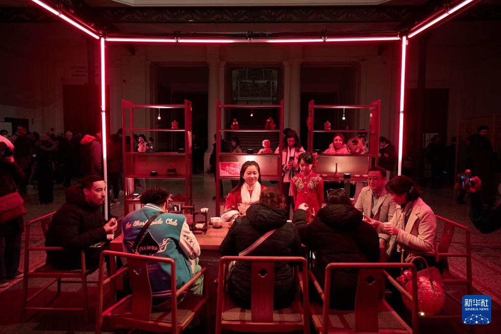 2月13日,观众在比利时布鲁塞尔皇家艺术与历史博物馆内体验光影茶榭。