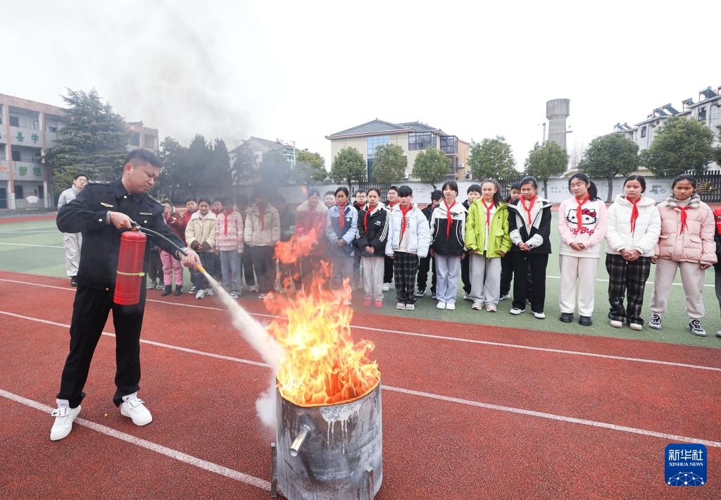 2月14日,东林镇应急消防管理站工作人员指导东林二小学生灭火器的正确使用方法。