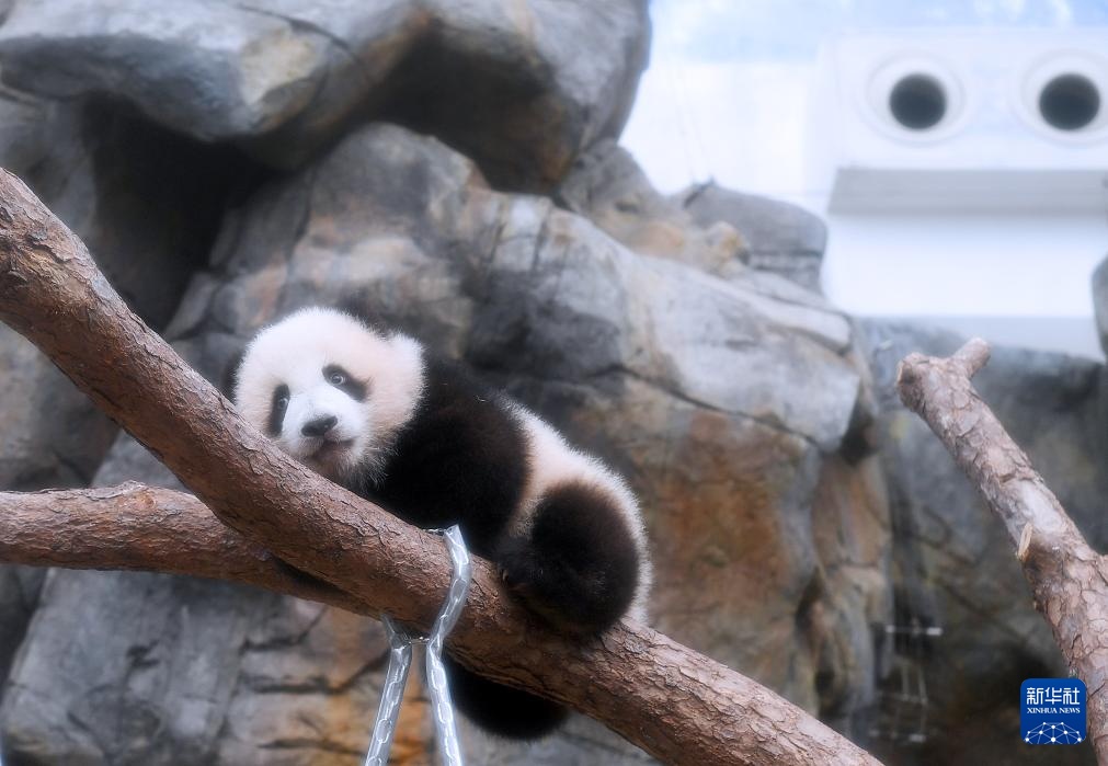 2月15日,大熊猫宝宝在香港海洋公园“大熊猫之旅”熊猫生活场馆内玩耍。
