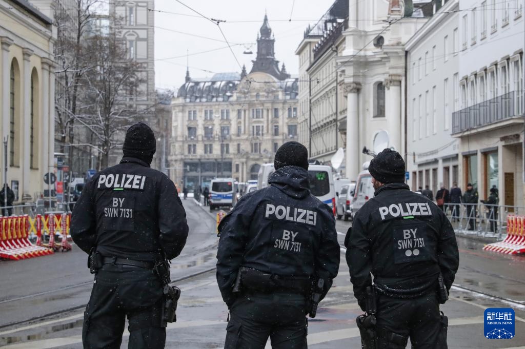 2月16日,在德国慕尼黑,警察在举办慕安会的酒店附近警戒。