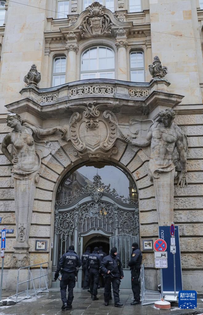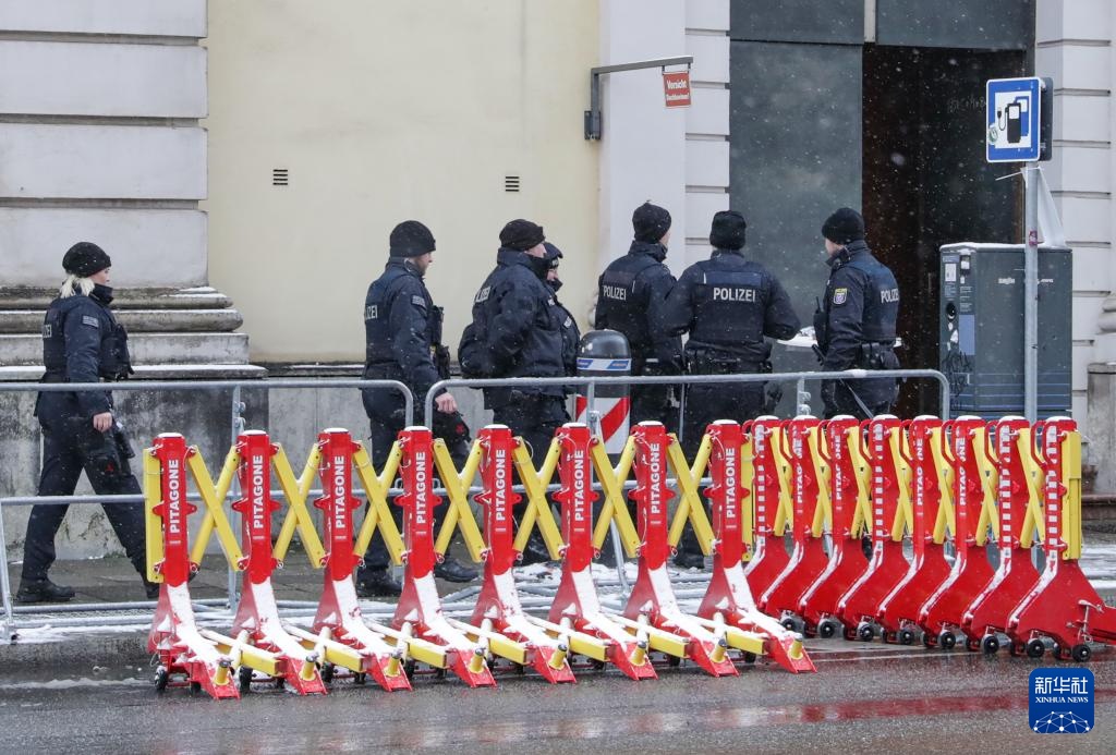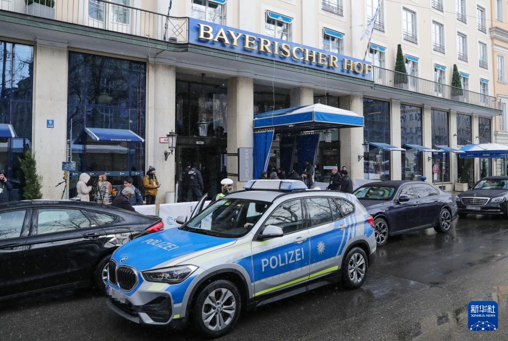 2月16日,在德国慕尼黑,警察在举办慕安会的酒店旁警戒。