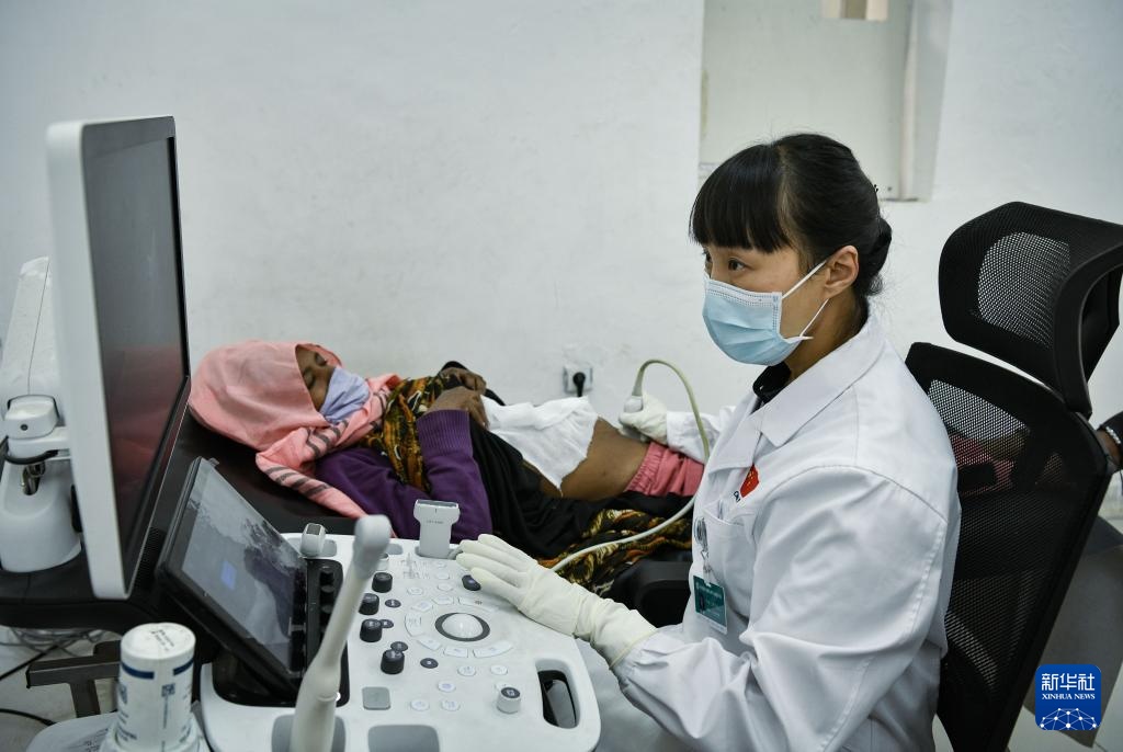 2月14日,在位于埃塞俄比亚首都亚的斯亚贝巴的蒂鲁内什-北京医院,中方超声科医生李娟为患者做检查。