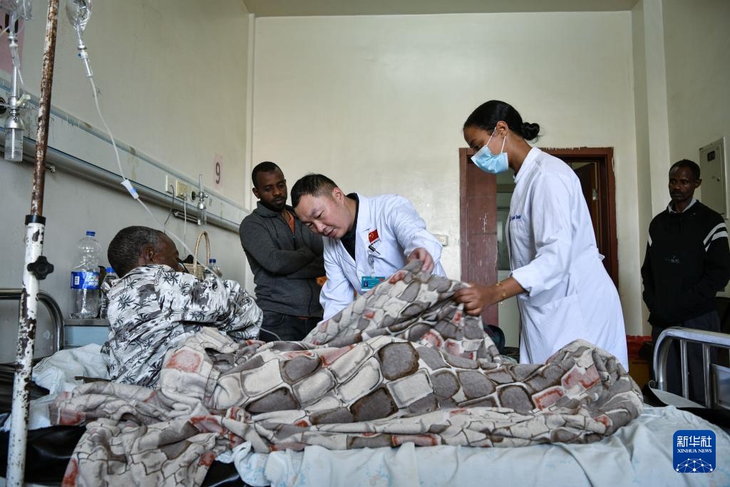 2月14日,在位于埃塞俄比亚首都亚的斯亚贝巴的蒂鲁内什-北京医院,中方泌尿外科医生李浩和当地医护人员在病房检查一名术后患者恢复情况。