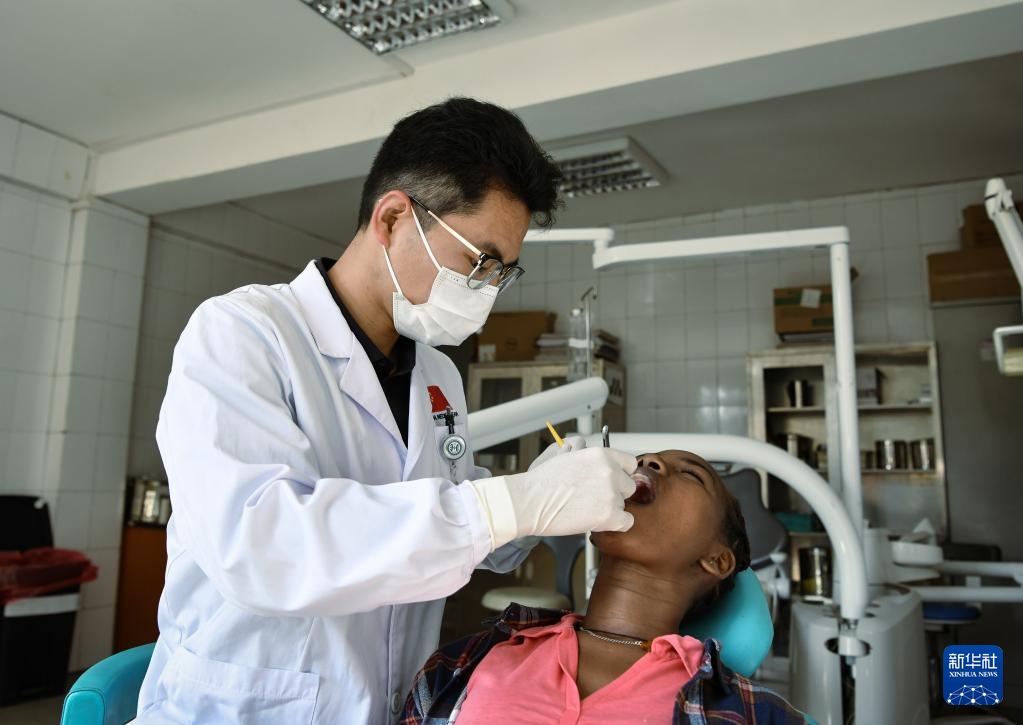 2月14日,在位于埃塞俄比亚首都亚的斯亚贝巴的蒂鲁内什-北京医院,中方口腔科医生高崇为患者做检查。