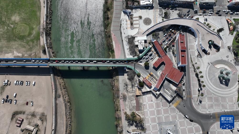 2月16日,在墨西哥科阿韦拉州彼德拉斯内格拉斯市,车辆在一座国际桥上行驶,画面右侧为墨西哥(无人机照片)。