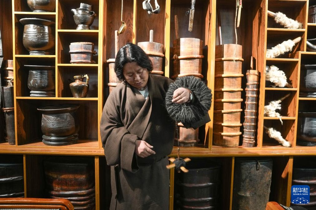 “牧人宝库”藏式茶馆主人珠珠演示纺羊毛线用的工具(2月13日摄)。