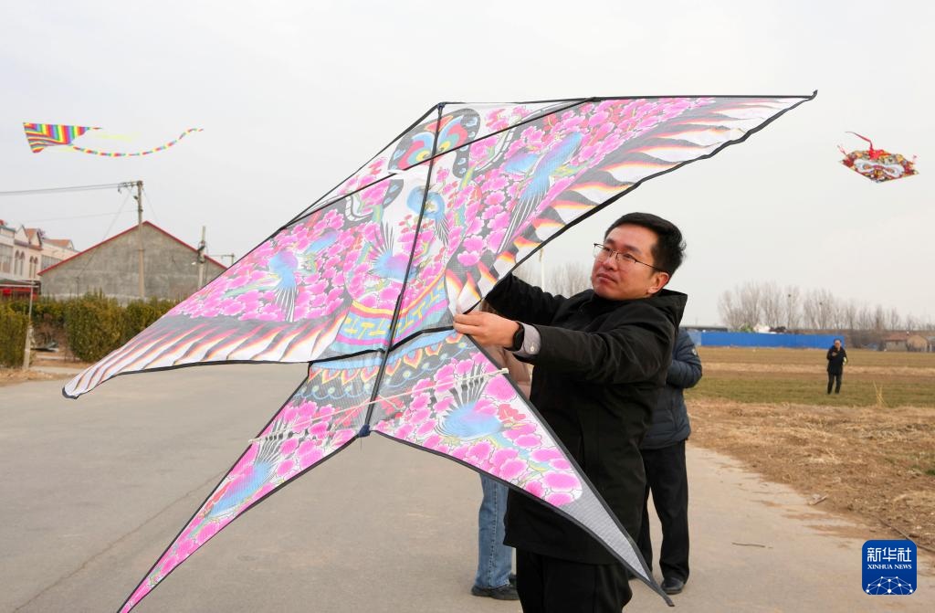 2月18日,在山东省潍坊市坊子区王家庄子村,人们试飞风筝产品。