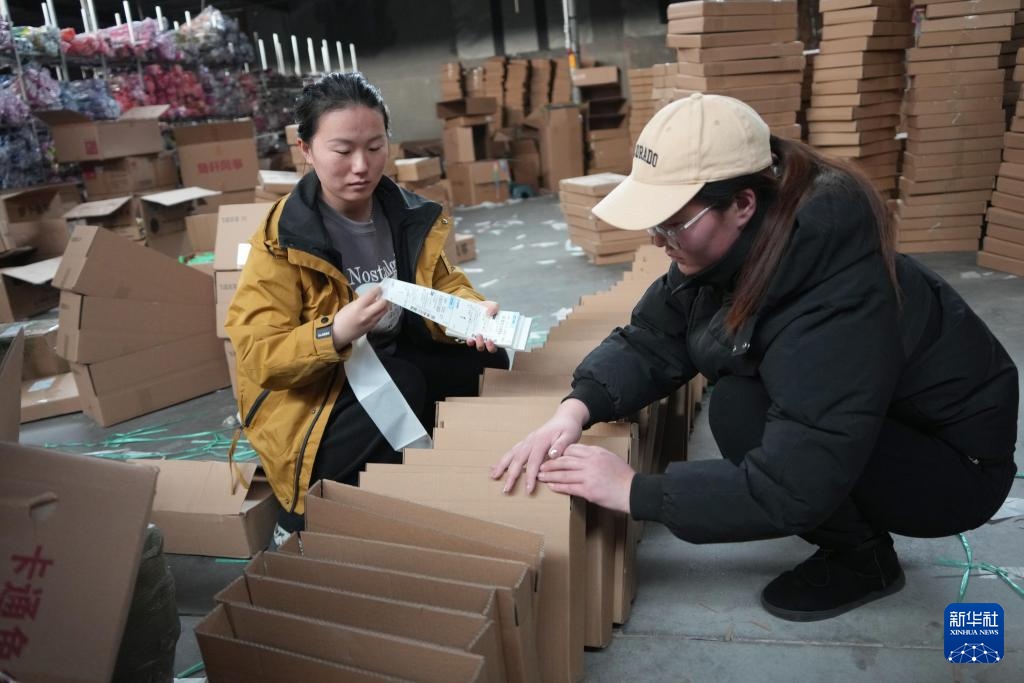 2月18日,在山东省潍坊市坊子区王家庄子村一家风筝企业,工作人员为网络销售的风筝外包装贴上发货信息单。