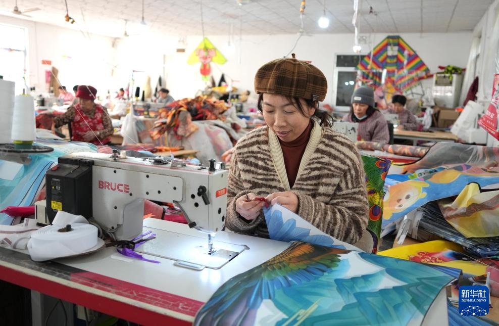 2月18日,在山东省潍坊市坊子区王家庄子村一家风筝企业,工作人员生产制作风筝。