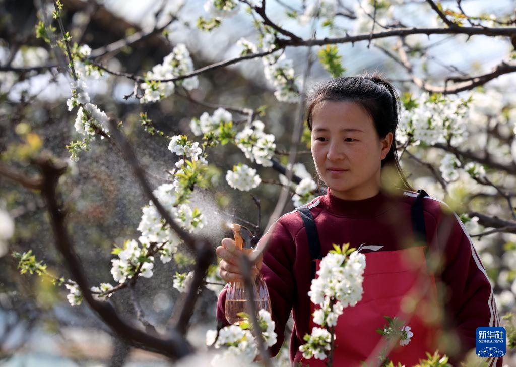2月19日,河北省晋州市周家庄乡第七生产队的果农在大棚内给樱桃花授粉。