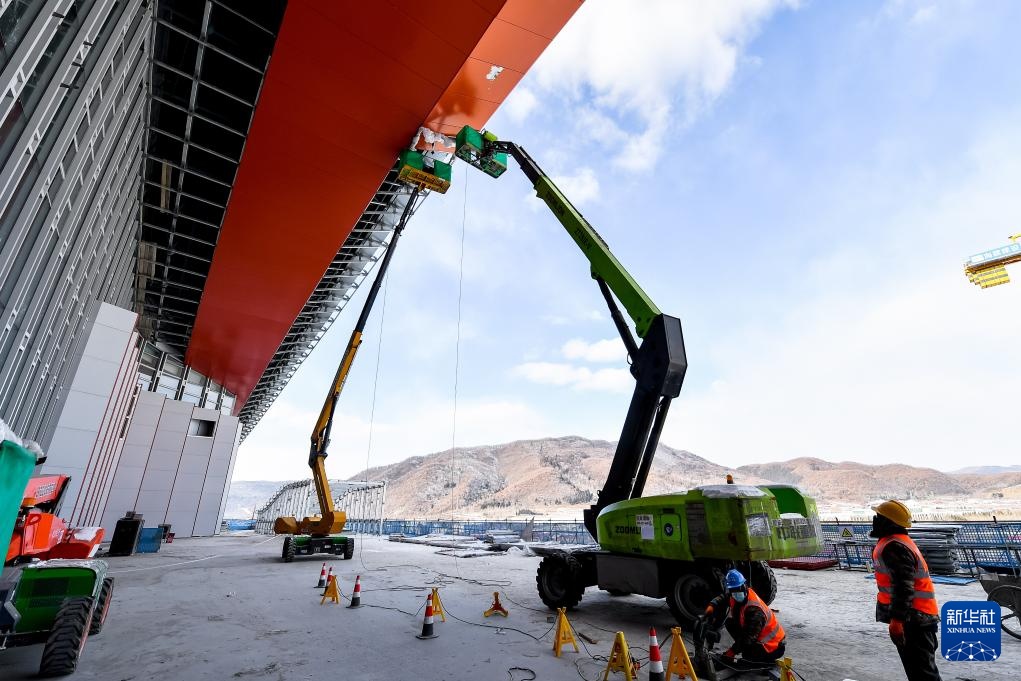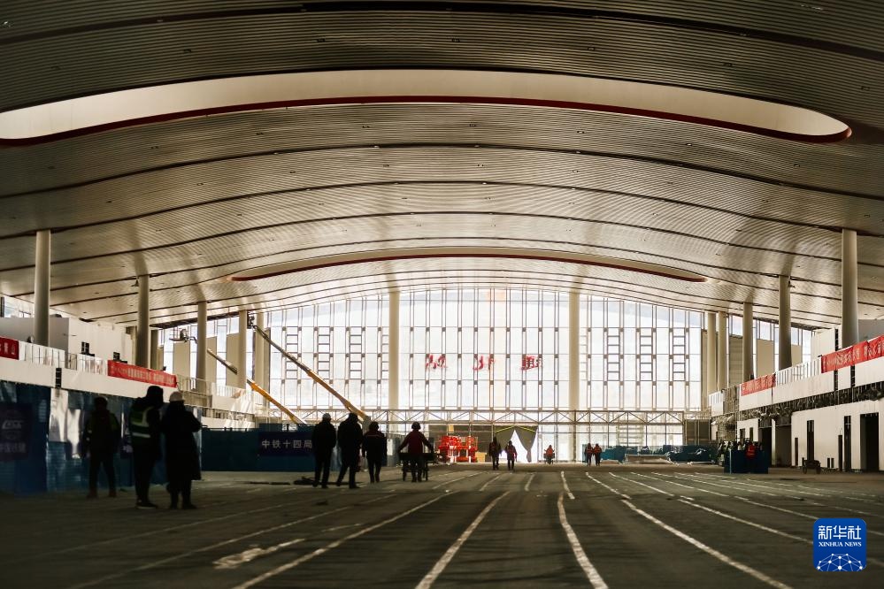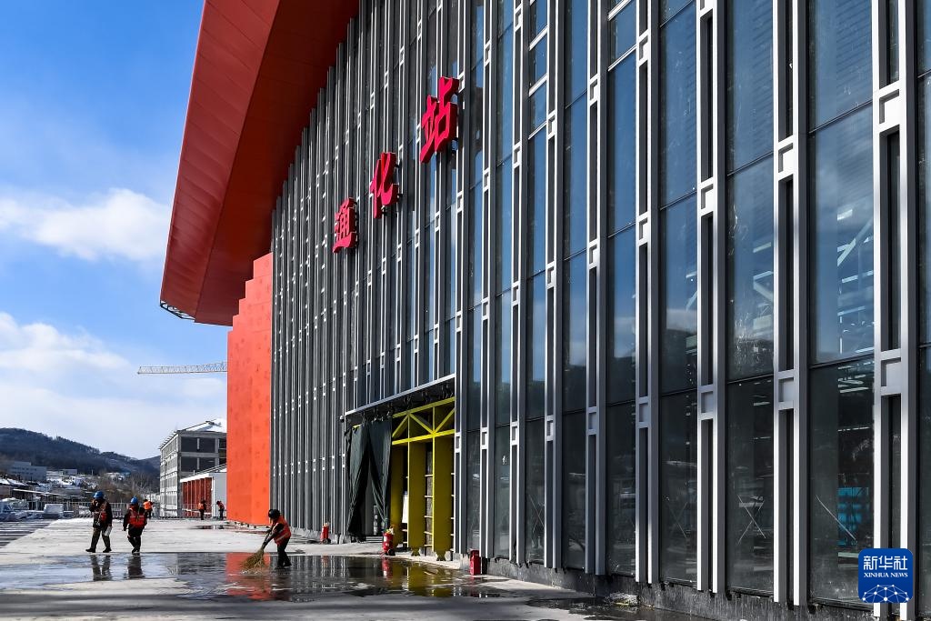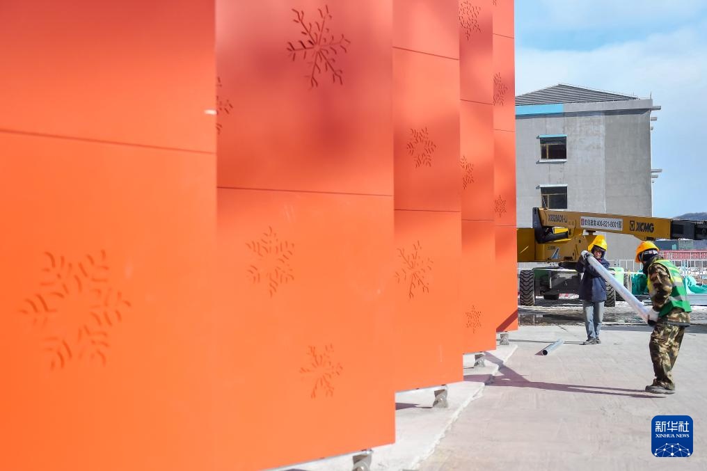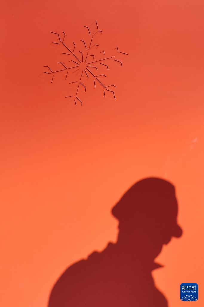 2月18日,在通化站建设现场,施工人员的影子映照在突显当地冰雪文化元素的“雪花”外墙装饰上。