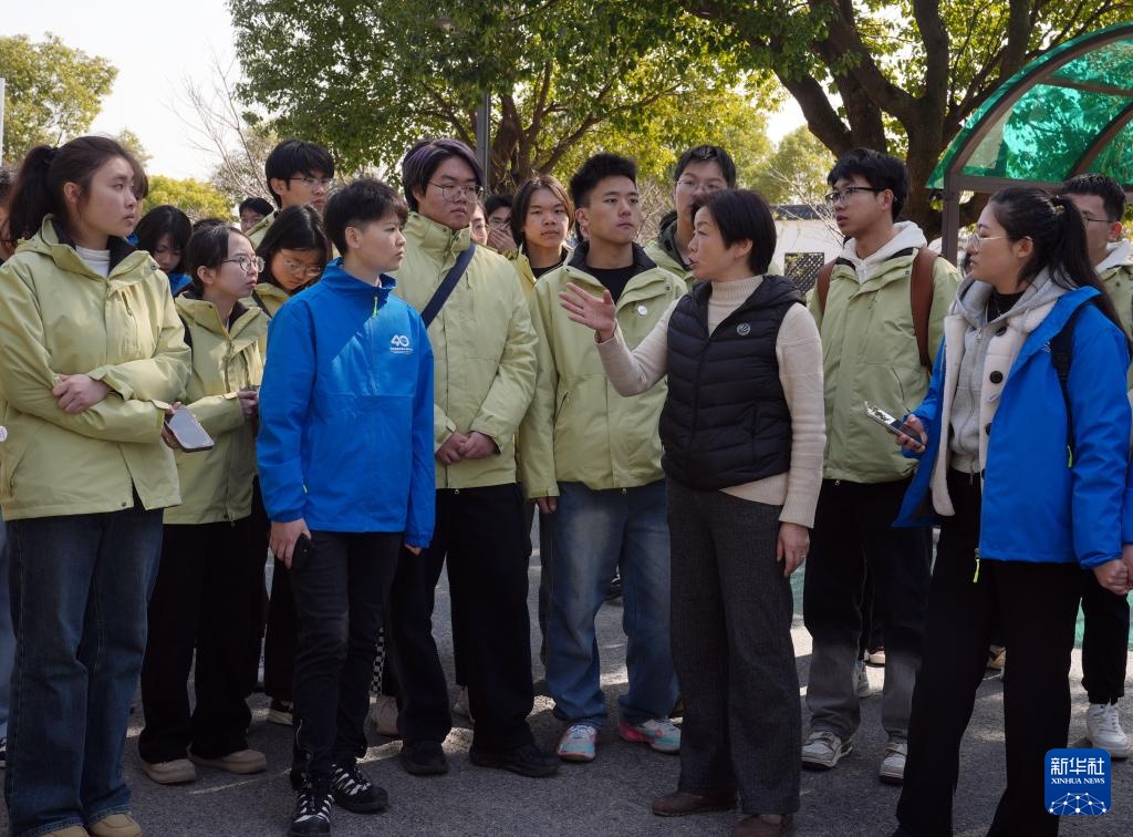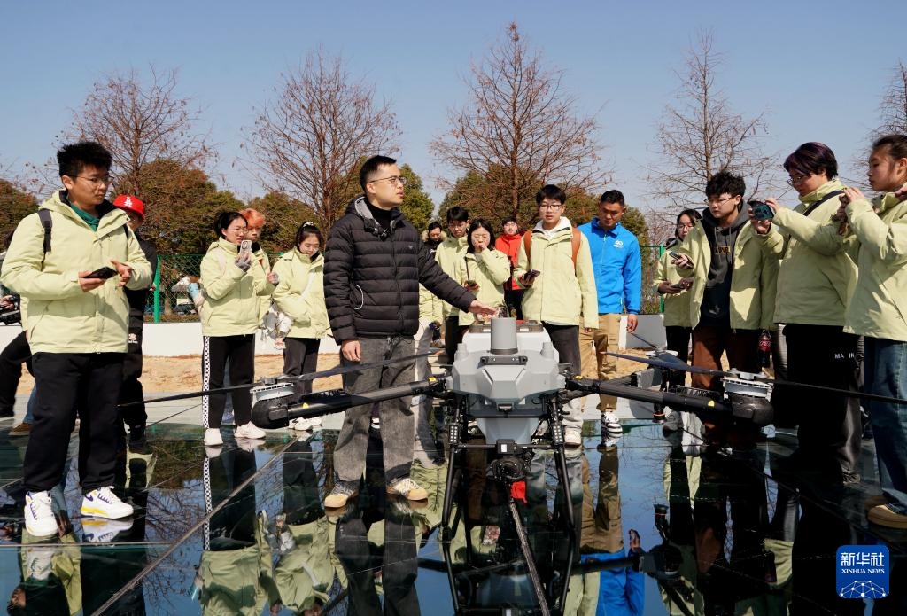 2月18日,在上海昆秀水产专业合作社,行业导师许翔为学生介绍用于播撒饲料、施肥的植保无人机。