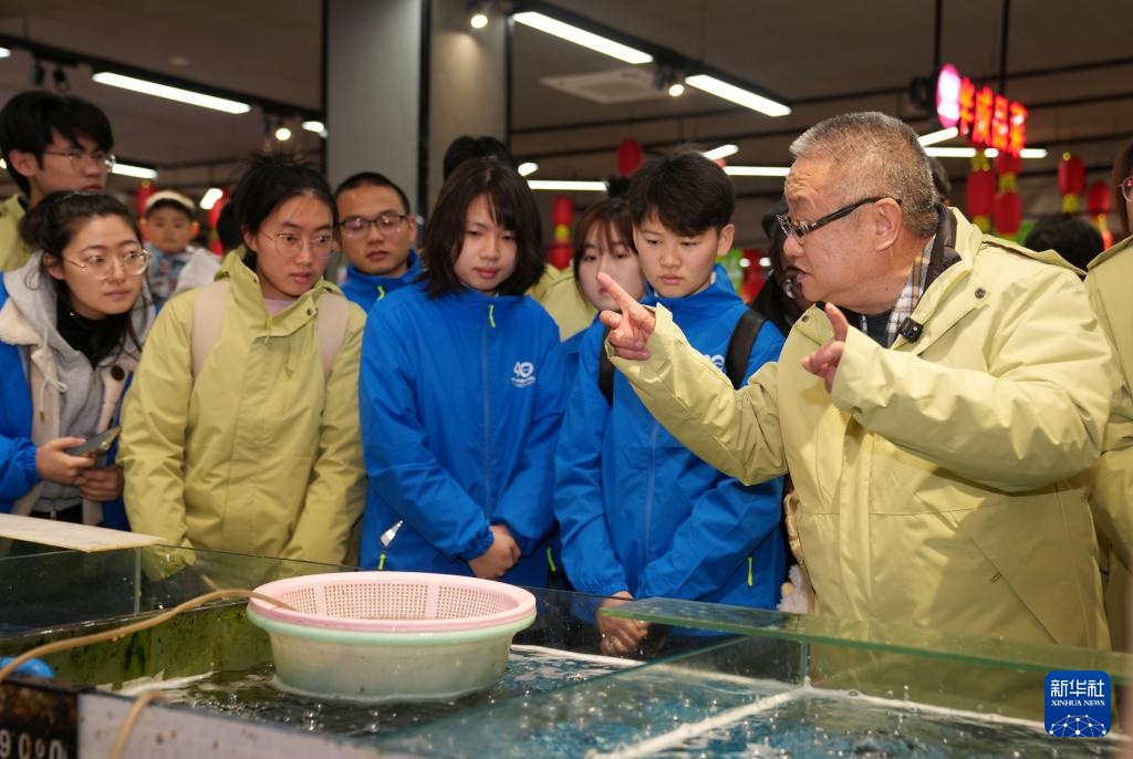 2月18日,在玉昆生鲜集市的水产品区,上海海洋大学水产与生命学院高级工程师王春为学生讲授水产品的相关知识。