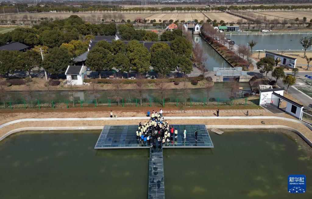 2月18日,上海海洋大学农业专项班的学生在上海昆秀水产专业合作社实地学习(无人机照片)。