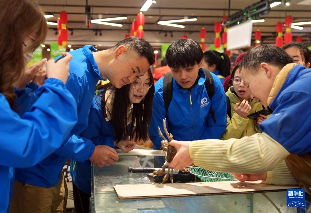 2月18日,在玉昆生鲜集市的水产品区,农业专项班的学生与经营户交流。