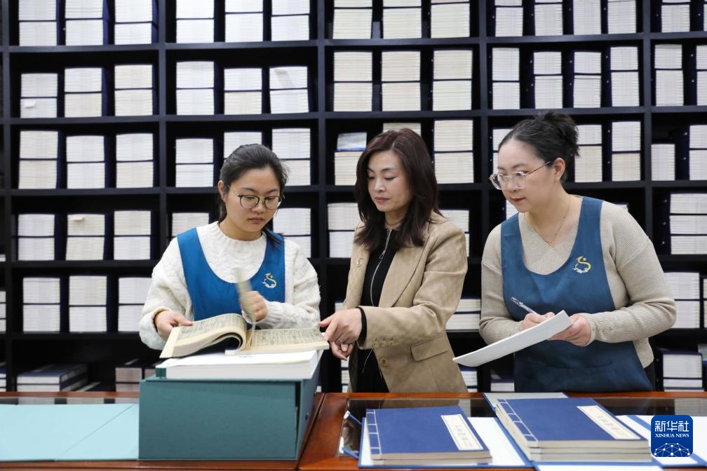 2月19日,工作人员在泾县三希堂线装文化园藏书馆检查再造古籍善本的保存状况。