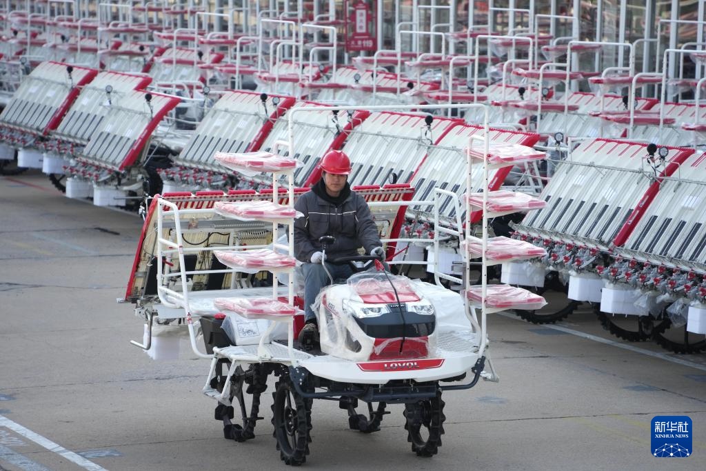 2月19日,工人在位于潍坊市的潍柴雷沃智慧农业科技股份有限公司物流仓储区停放刚生产的插秧机。
