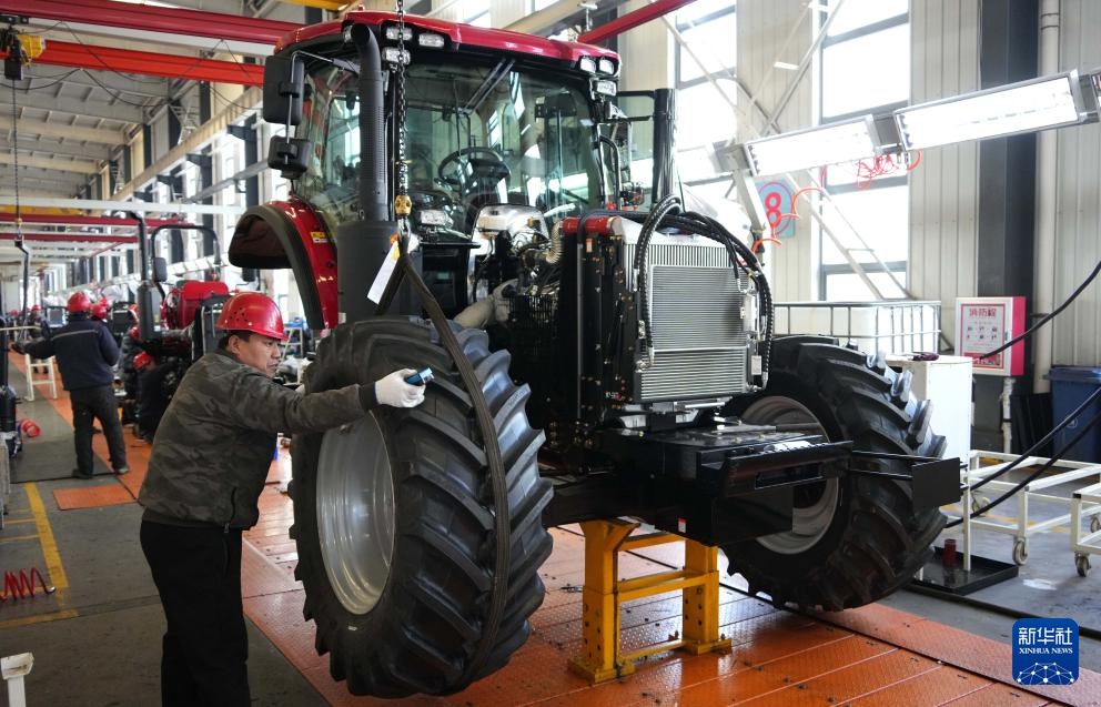 2月19日,工人在位于潍坊市的山东悍沃农业装备有限公司组装生产农机设备。