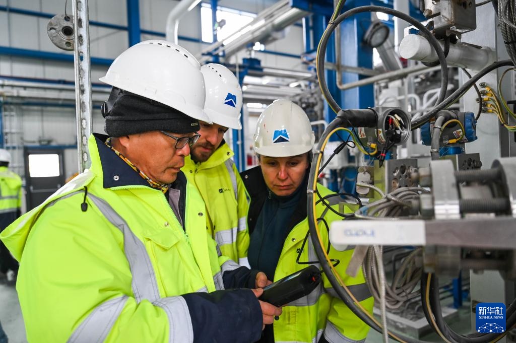 2月12日,中土两国工程师在土耳其阿克萨拉伊省的图兹湖地下天然气储库扩建项目地面场站查看设备。