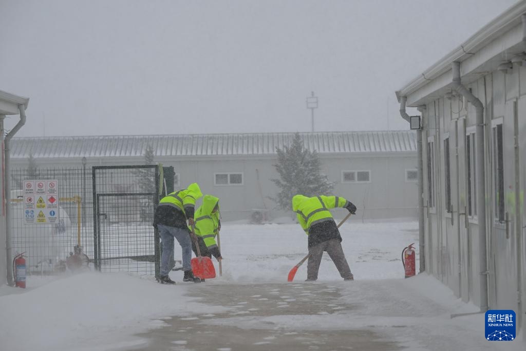 2月13日,在土耳其阿克萨拉伊省的图兹湖地下天然气储库扩建项目现场,员工在项目地住宿区清理积雪。