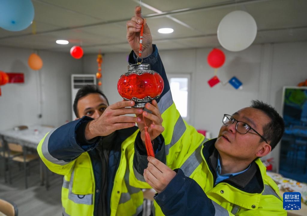 2月12日,中土两国员工在土耳其阿克萨拉伊省的图兹湖地下天然气储库扩建项目地挂灯笼庆祝元宵节。