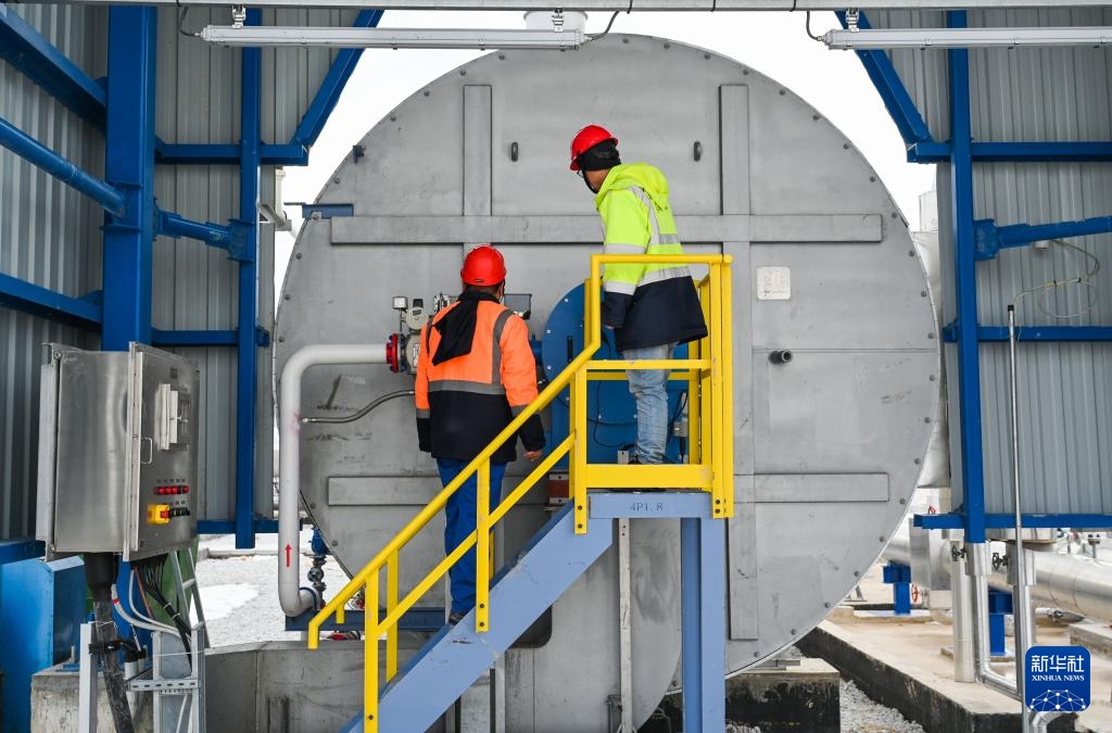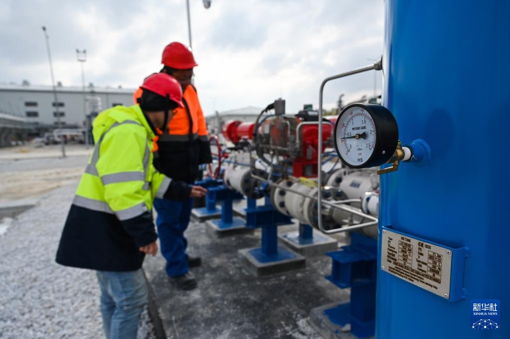 2月12日,中国工作人员在土耳其阿克萨拉伊省的图兹湖地下天然气储库扩建项目地面场站查看设备。