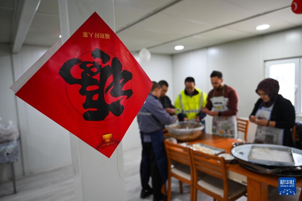 2月12日,中土两国员工在土耳其阿克萨拉伊省的图兹湖地下天然气储库扩建项目地包饺子。