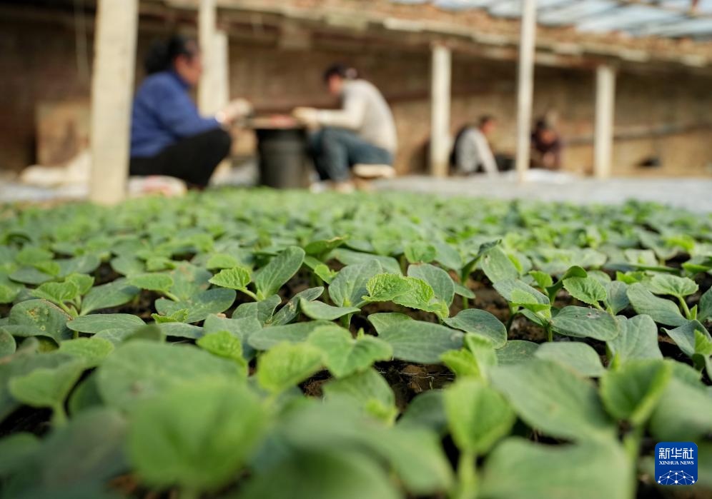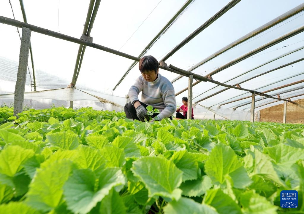 2月20日,河北省新乐市邯邰镇小流村国峰西瓜合作社的社员在大棚内管护西瓜秧苗。