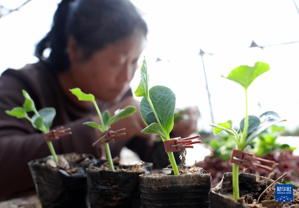 2月20日,河北省新乐市邯邰镇的农民在嫁接甜瓜秧苗。