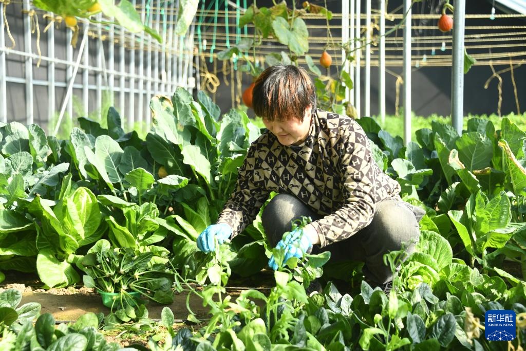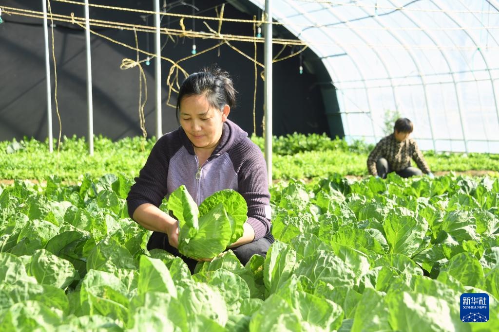 2月20日,工作人员在北京市平谷区峪口镇的北京秾秾生态农场采摘蔬菜。