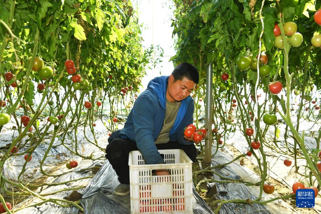 2月20日,工作人员在北京市平谷区峪口镇的北京秾秾生态农场采摘西红柿。