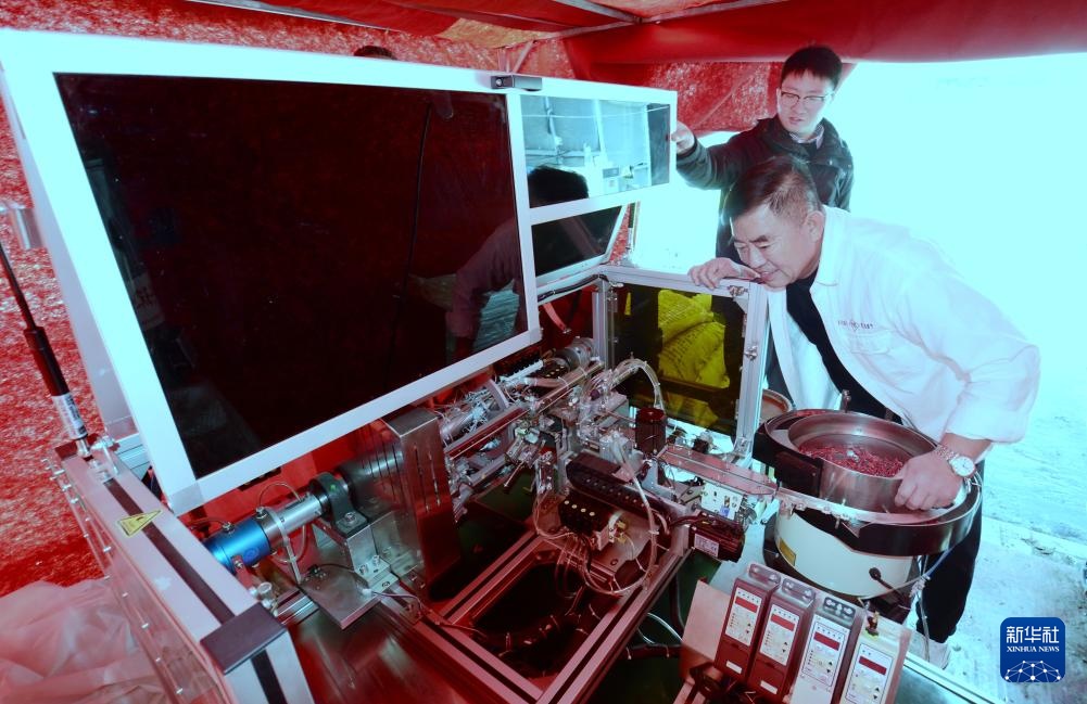 2月19日,大兴区老宋瓜果专业合作社负责人宋绍堂(前)在调试新引进的智能嫁接设备。