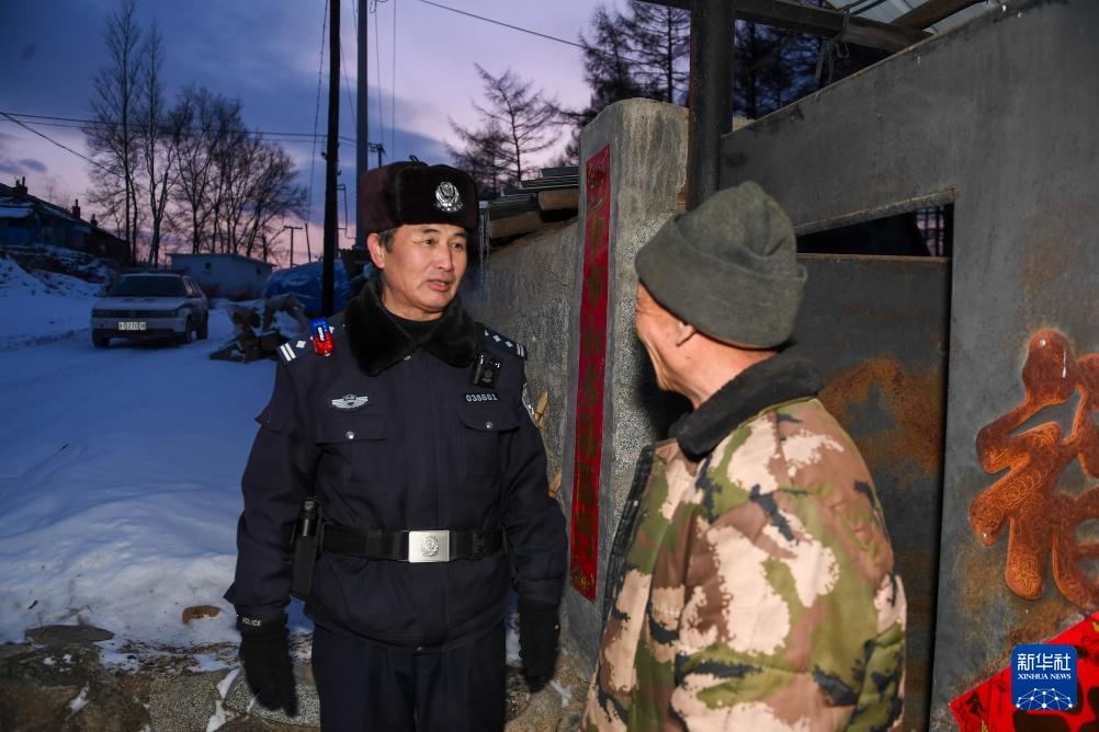 2月18日,在吉林省蛟河市白石山镇,杨洪彬(左)走访铁路沿线居民。
