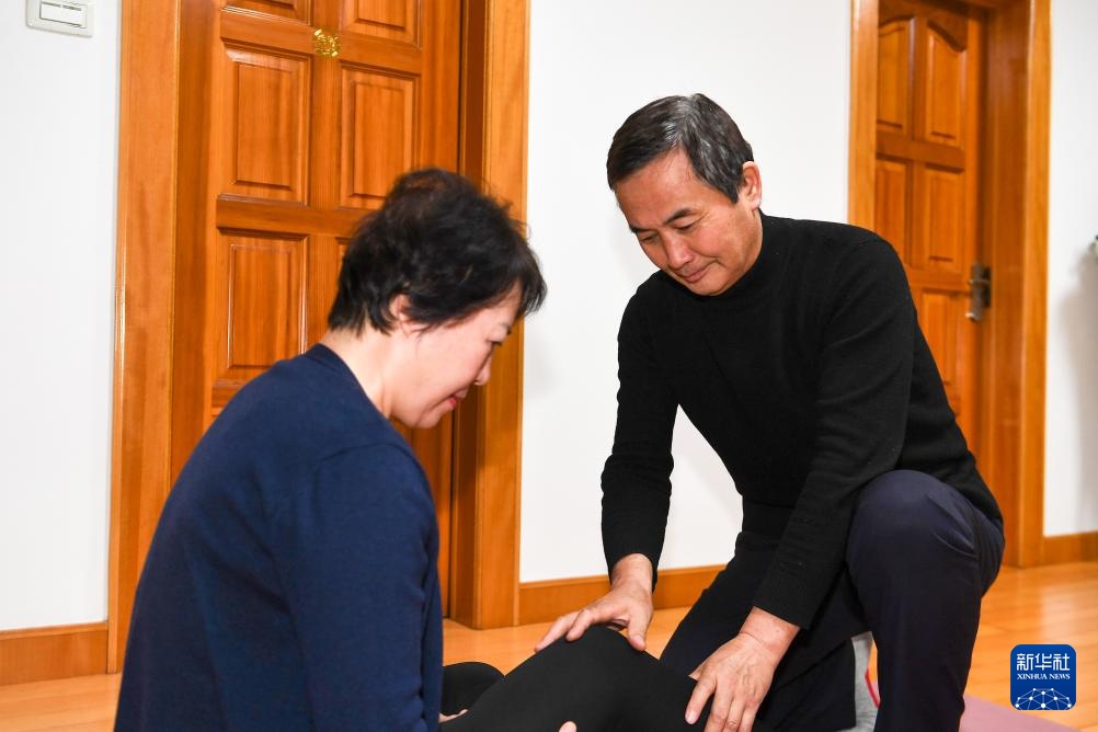 2月19日,在吉林省蛟河市白石山镇,杨洪彬(右)照顾手术后进行康复训练的妻子周秀芬。