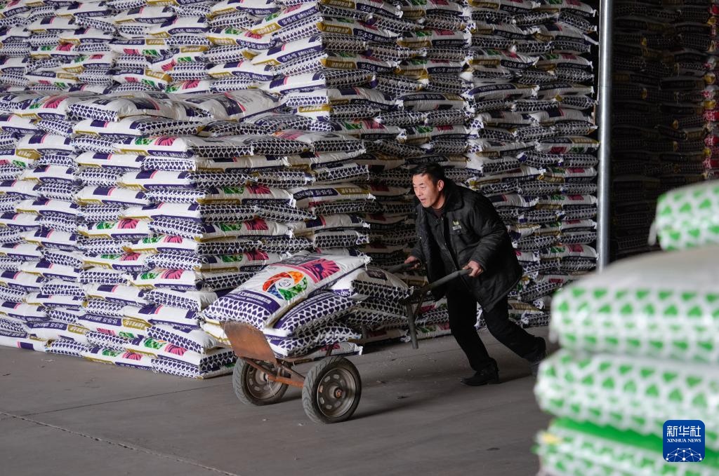 工作人员在宁夏同心县石狮镇一家种子经销点装货(2月20日摄)。