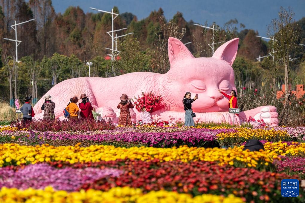 2月21日,游客在昆明市海洪莫奈花园与粉色猫咪雕塑合影。