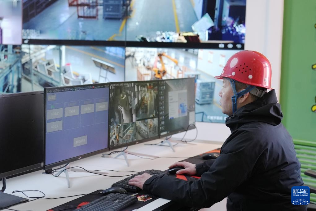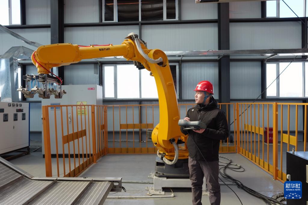 2月20日,在位于双鸭山市的北大荒农业股份有限公司友谊分公司第三管理区水稻智能育秧中心,技术人员调试自动拆垛机械手。