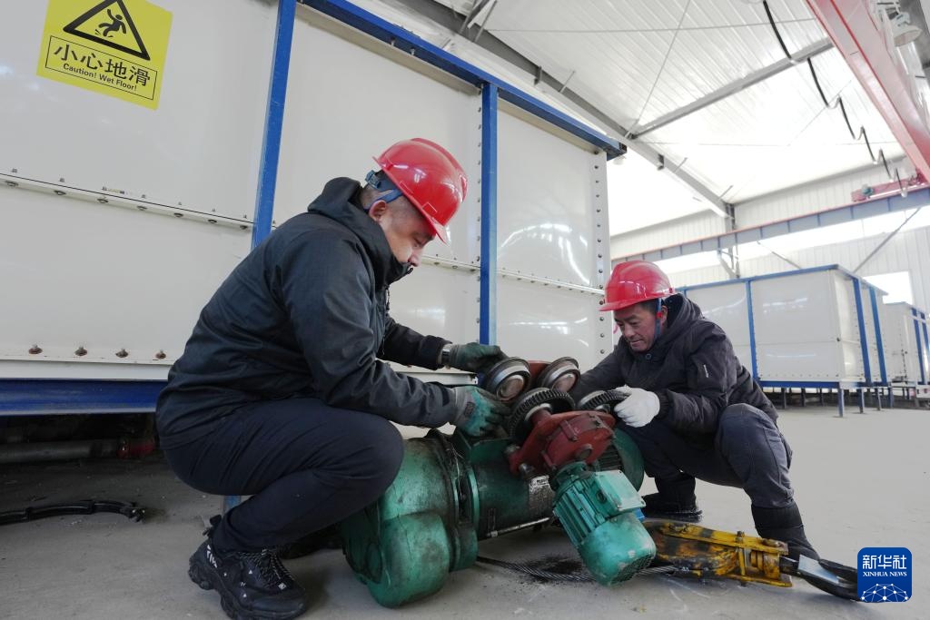 2月20日,在位于双鸭山市的北大荒农业股份有限公司友谊分公司第五管理区水稻智能芽种基地,技术人员检修智能浸种催芽设备。