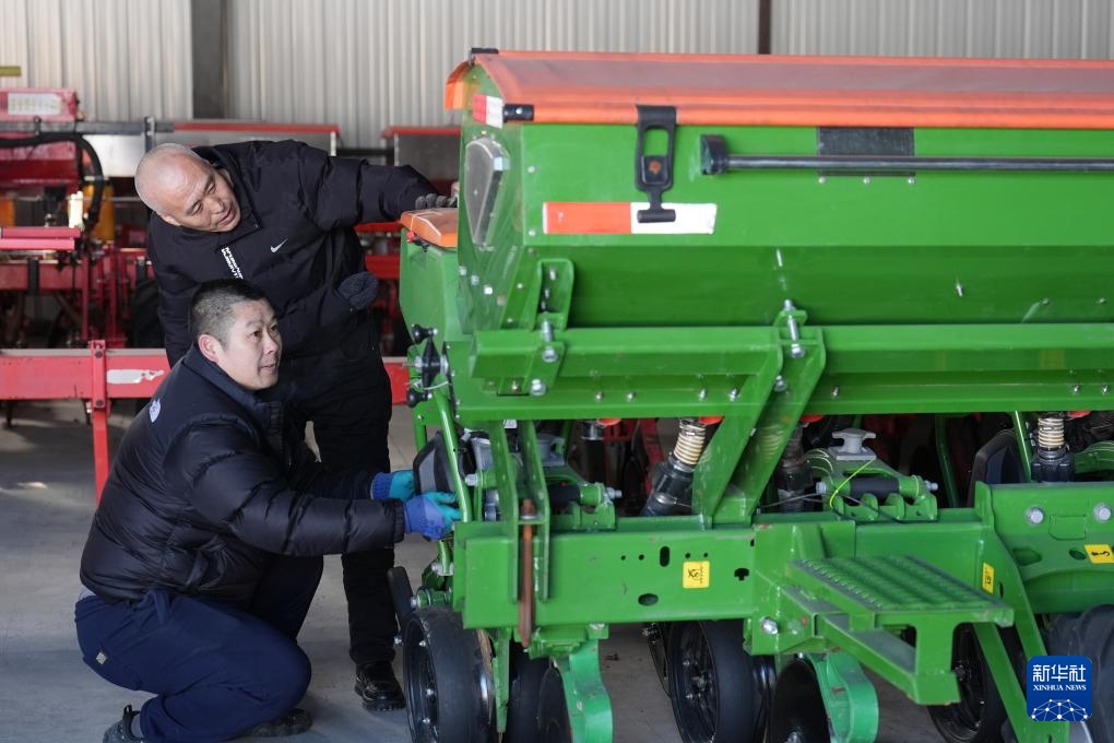 2月20日,在位于双鸭山市的北大荒农业股份有限公司友谊分公司第五管理区第二作业站农机停放中心,友谊分公司员工检修保养农机具。