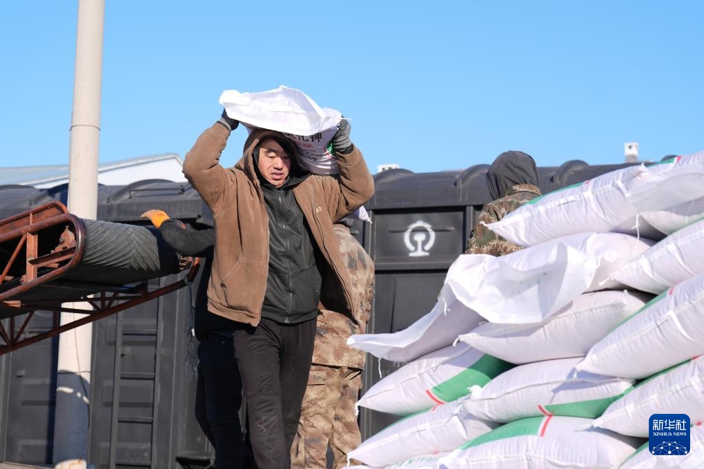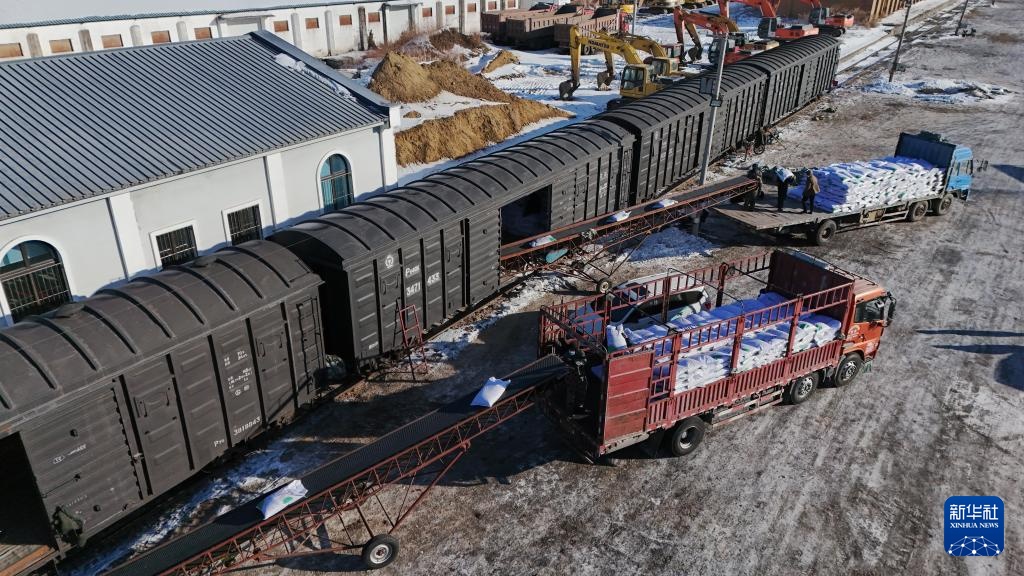 2月20日,在位于双鸭山市的北大荒农业股份有限公司友谊分公司铁路农资货运专用线货运站,工人进行化肥卸车转运作业。