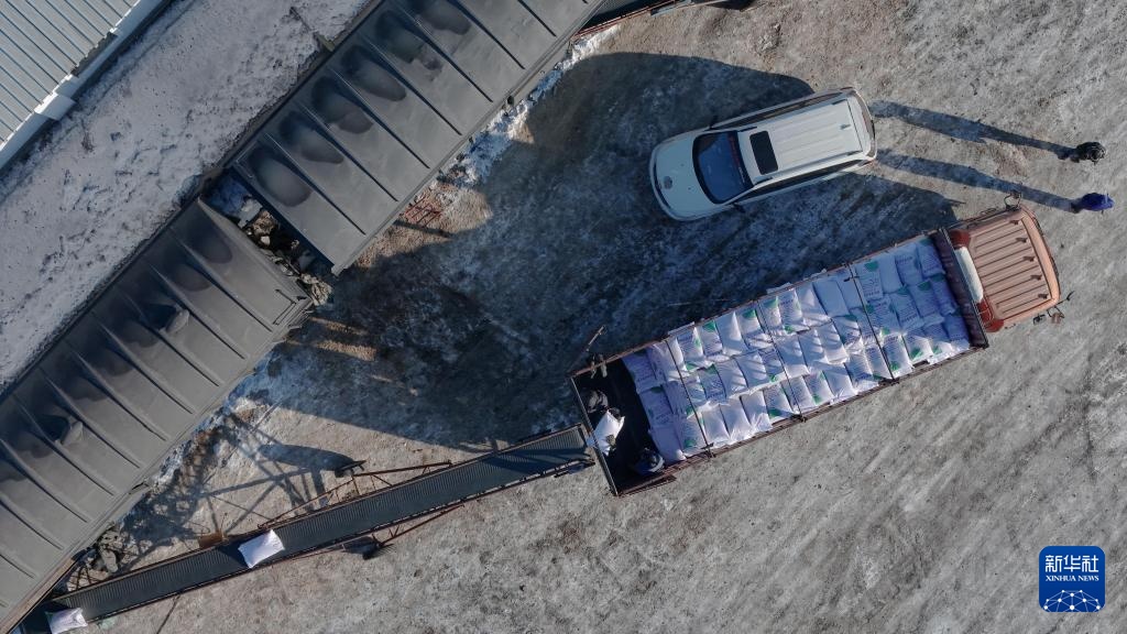 2月20日,在位于双鸭山市的北大荒农业股份有限公司友谊分公司铁路农资货运专用线货运站,工人进行化肥卸车转运作业(无人机照片)。