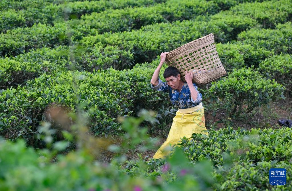 早春时节,海南省白沙黎族自治县原生态茶园小镇的茶园里,茶农们忙着采摘茶叶。