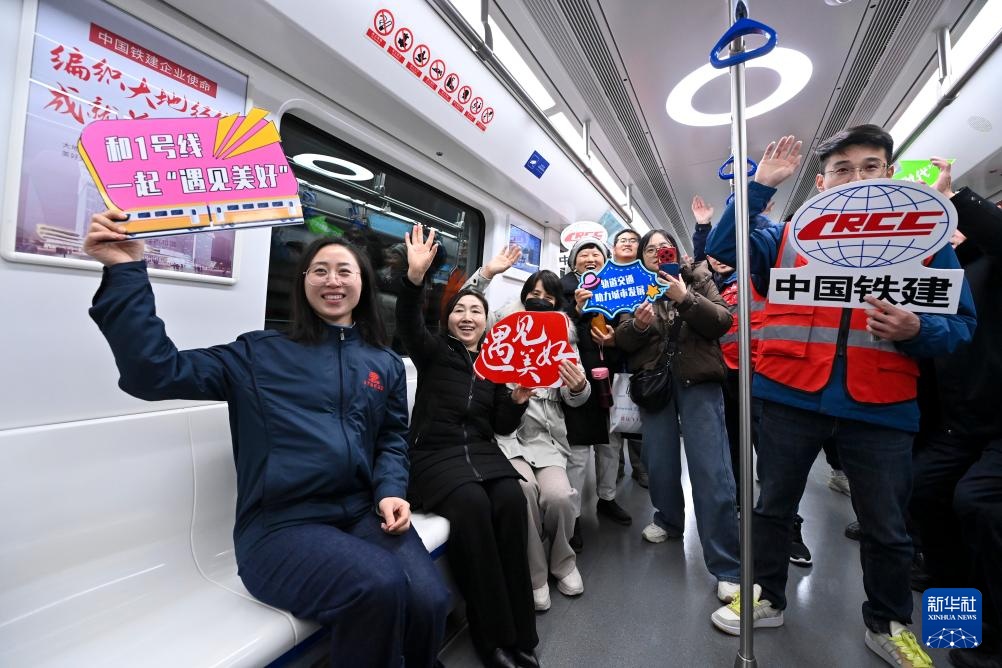 2月22日,参与建设者和乘客在太原轨道交通1号线列车上合影。