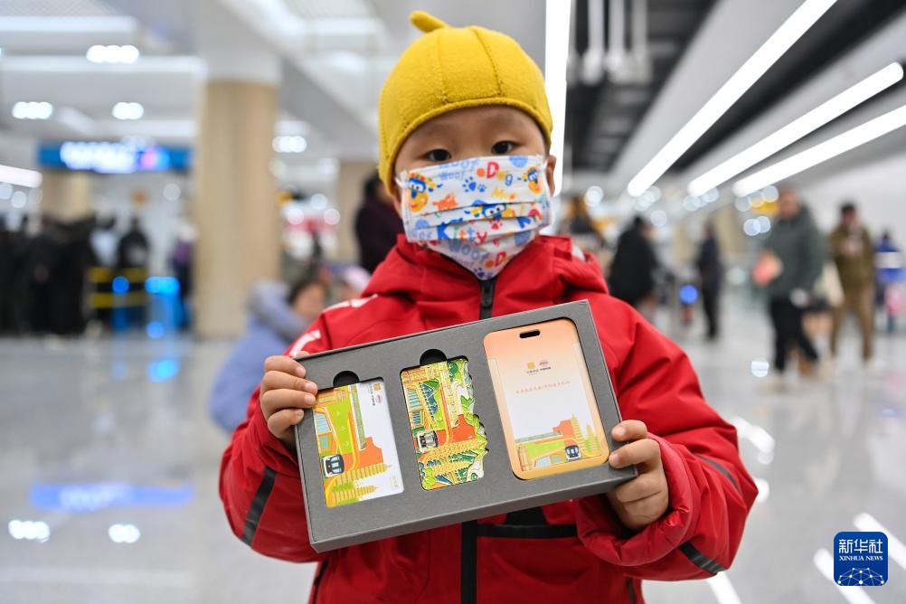 2月22日,在太原轨道交通1号线下元站,一名小朋友展示其领取的通车纪念票卡。