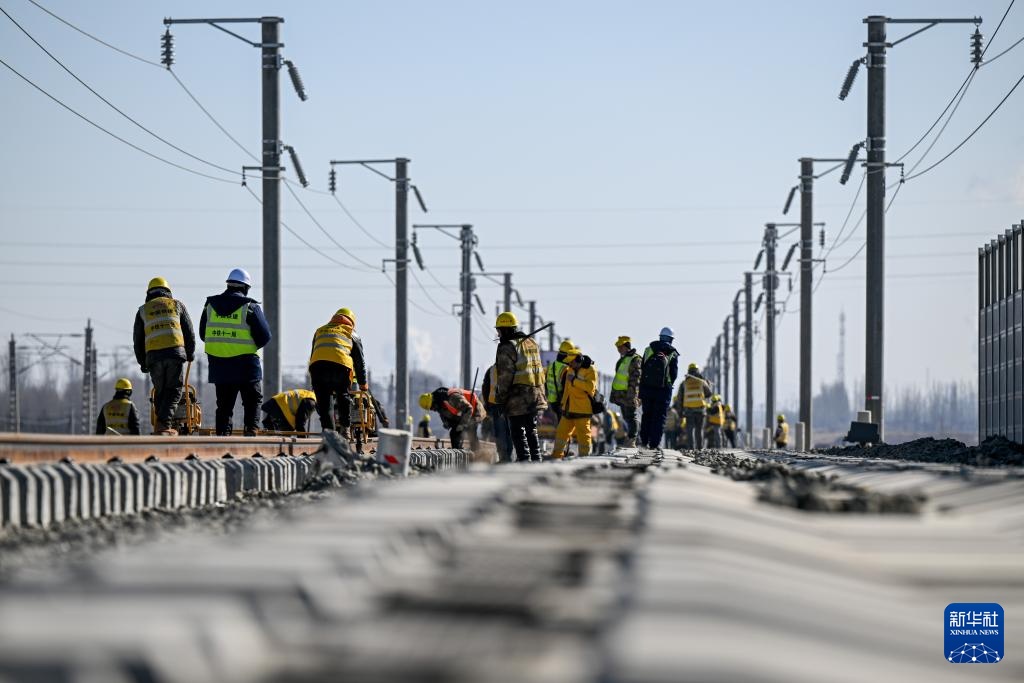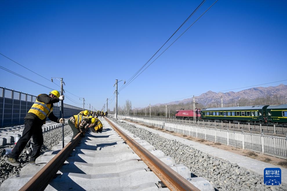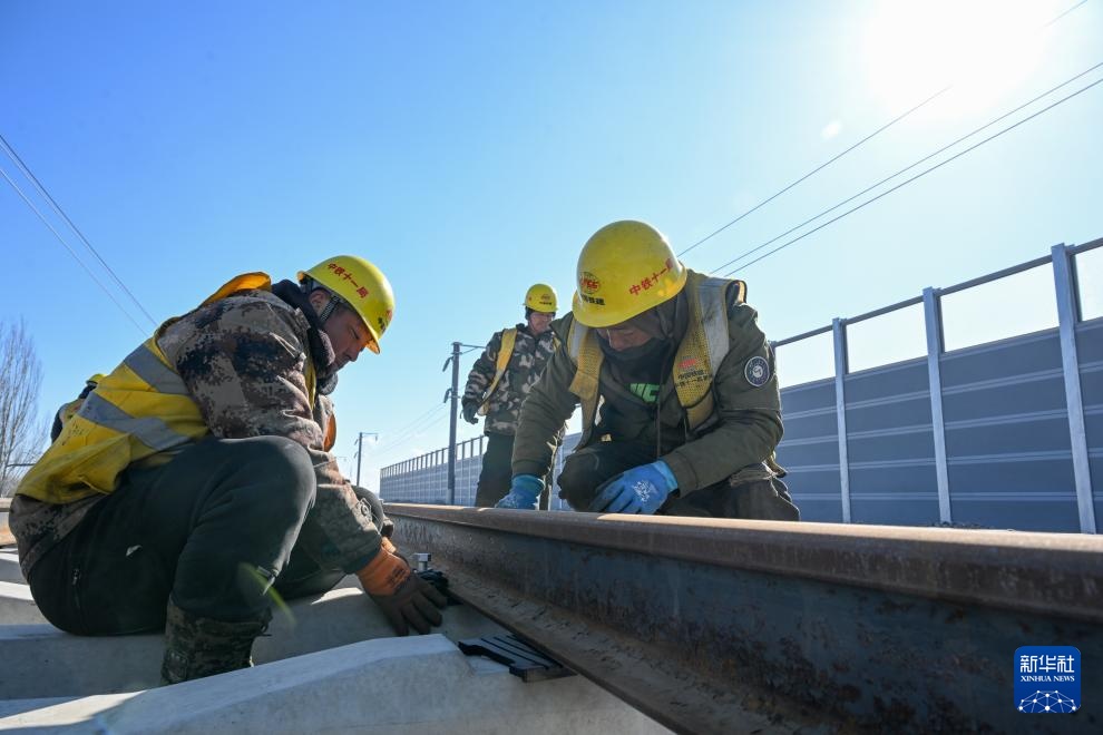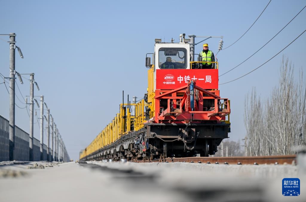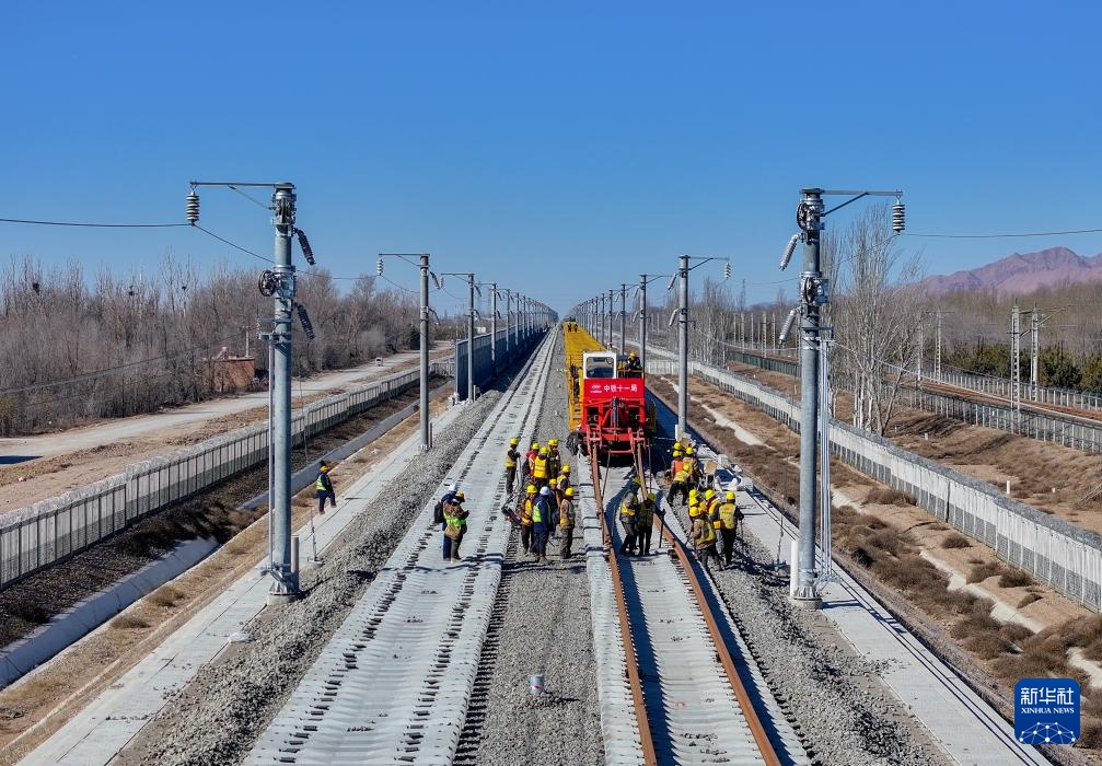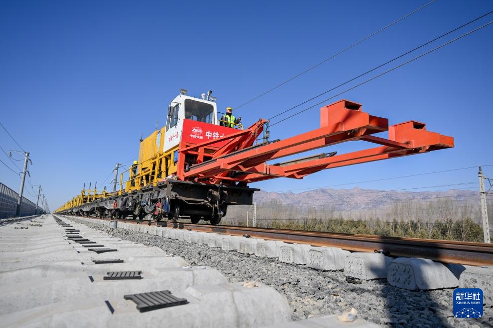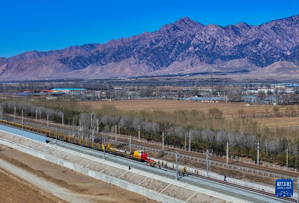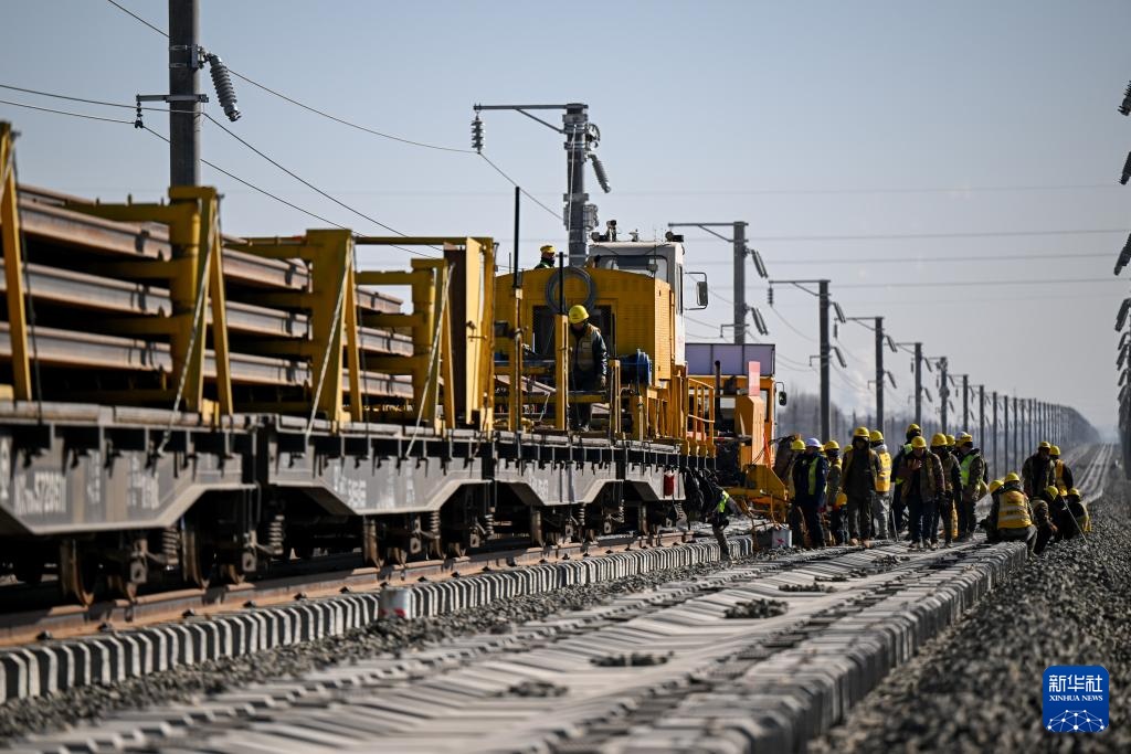 2月22日,施工人员在包银高铁内蒙古包头至临河区段进行铺轨作业。
