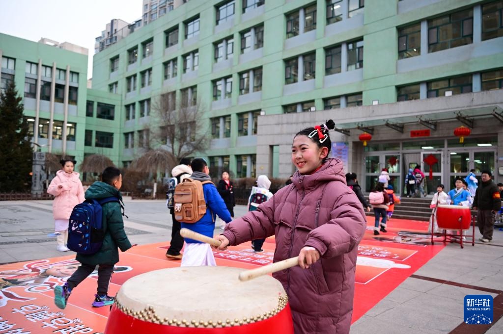 2月23日,西宁市城西区文汇小学一名装扮成“哪吒”造型的学生在敲鼓欢迎同学入校。