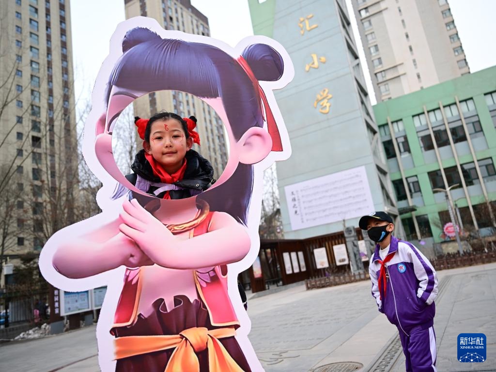 2月23日,西宁市城西区文汇小学学生在“哪吒”造型装饰前留影。