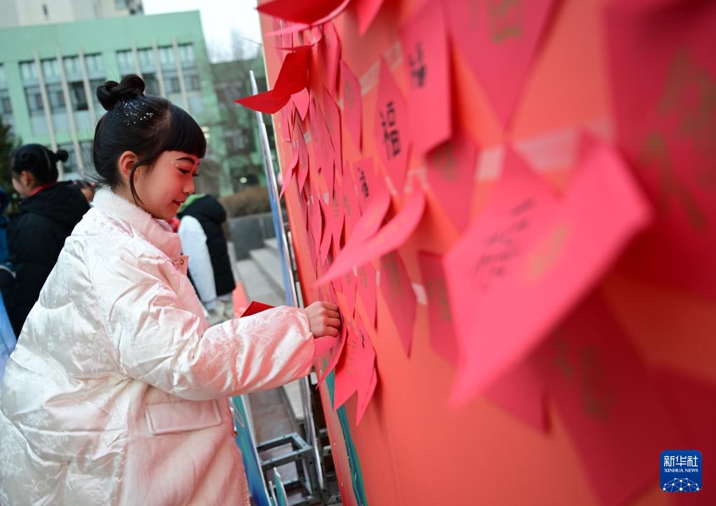 2月23日,西宁市城西区文汇小学学生在愿望墙上粘贴自己的新学期愿望。