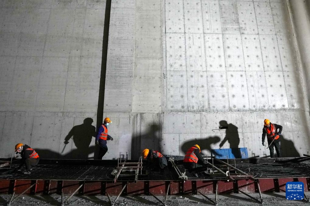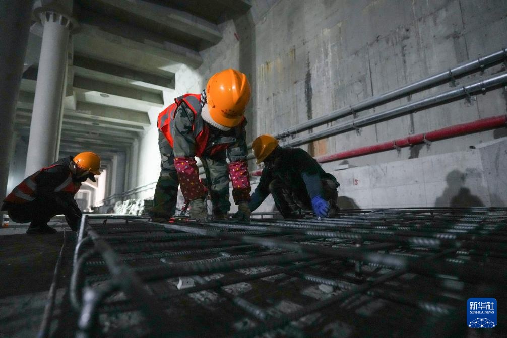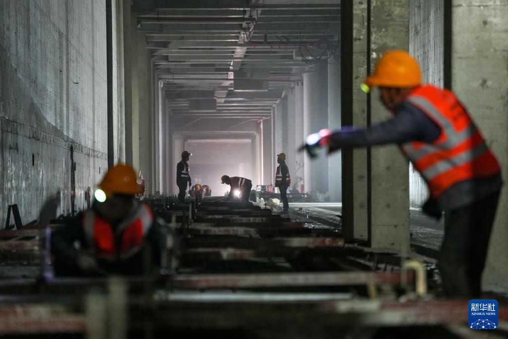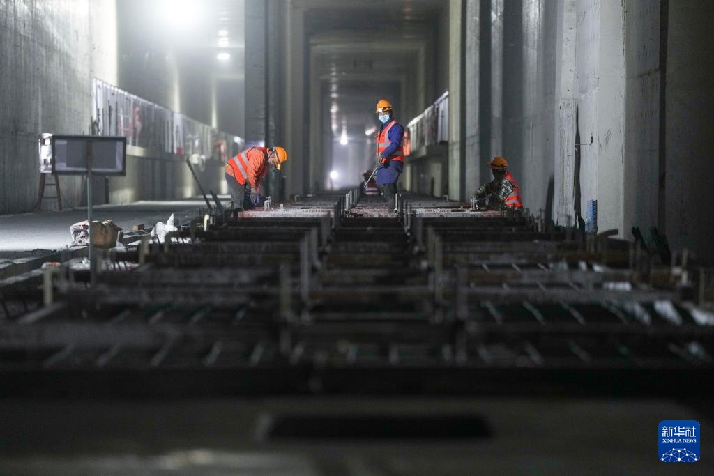 中铁十四局的施工人员在进行北京城市副中心站无砟轨道工程施工(2月22日摄)。
