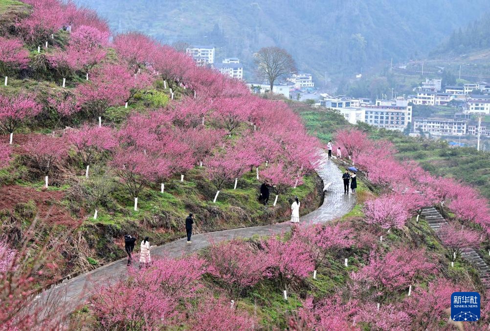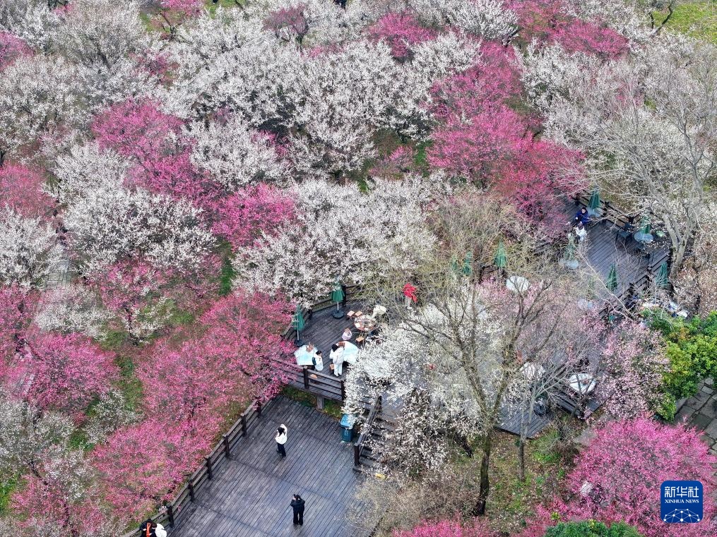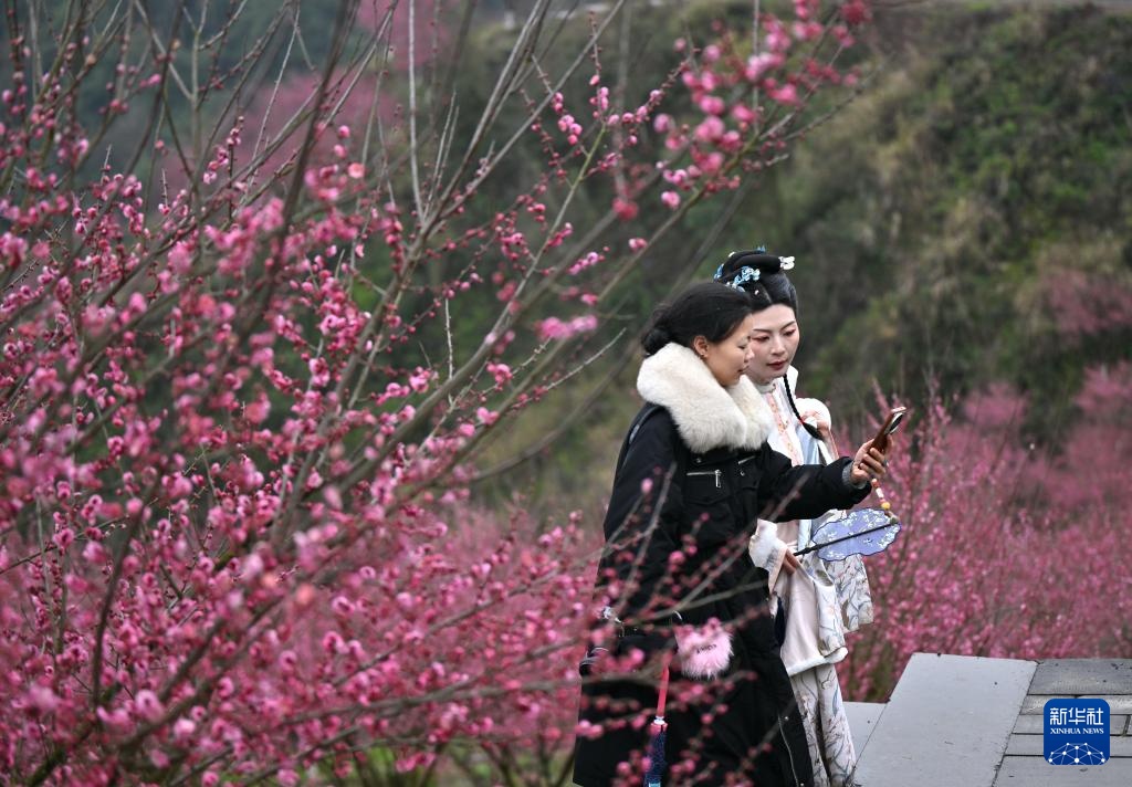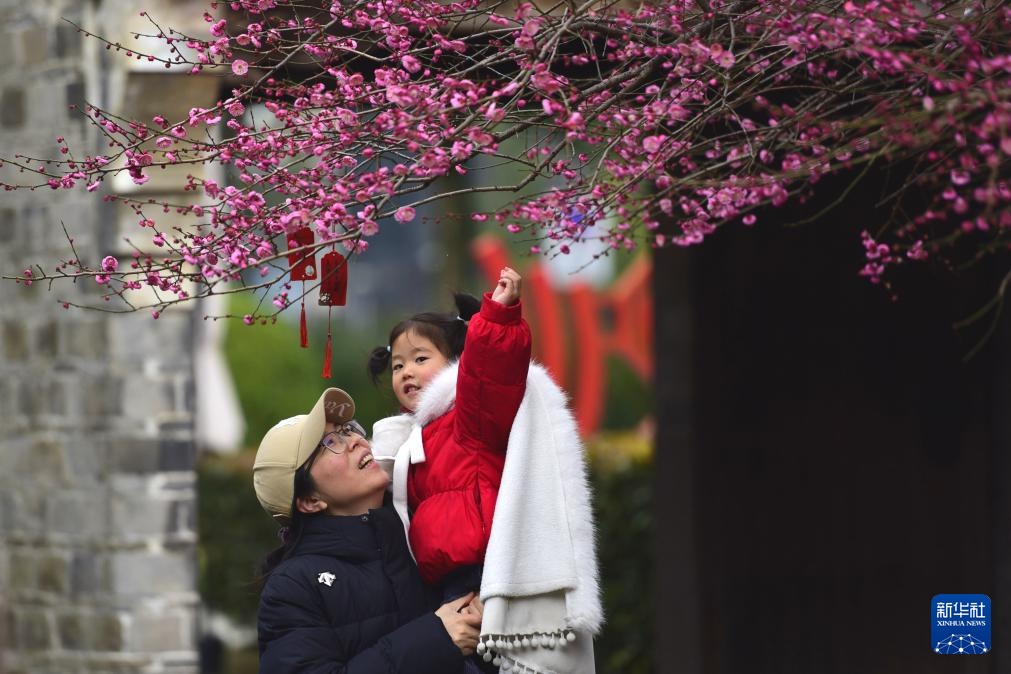 2月23日,游客在湖北省宣恩县仙山贡水旅游区的梅园踏青赏梅。